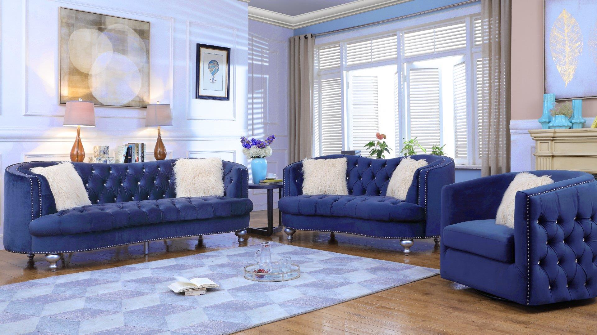 Upgrade your living room with our one-of-a-kind living room set. This modern transitional design provides tremendous aesthetic versatility and is ideal for your living room. The visual appeal of this glamorous modern living room set will grab you, but it's the cozy comfort that will have you falling head over heels. It has a solid and engineered wood frame, and it showcases a swivel pattern. First to catch your eye is the Fabric button-tufted velvet upholstery available in multiple colors that are as soft to the touch as alluring to the eye. This living room set includes Sofa, a Loveseat, a Chair, and Five unique pillows which will have you looking forward to your next nap. This swivel barrel structure brings an eye-catching design to your living room while the nail head patterns suggest a hint of traditional charm. The silver spindle Wood legs are next to catch your attention, which gives this sofa collection a unique Glam Hollywood look. The pillow backs and seat cushions are filled with foam and polyester, plus springs in the seats, for extra support at any time, day, or night. The velvet fabric upholstery brings out this Sofa's glamorous side. This sectional will offer you and your family perfect comfort to spend quality time together. It is ideal for those looking to spend hours sprawled out reading their favorite book or who want to cuddle with the one they love.